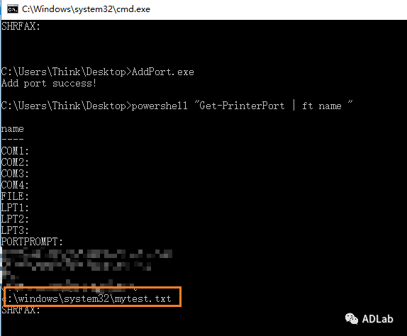 但如果设置打印端口名为“C:\Windows\system32\myport.txt”,则会失败。