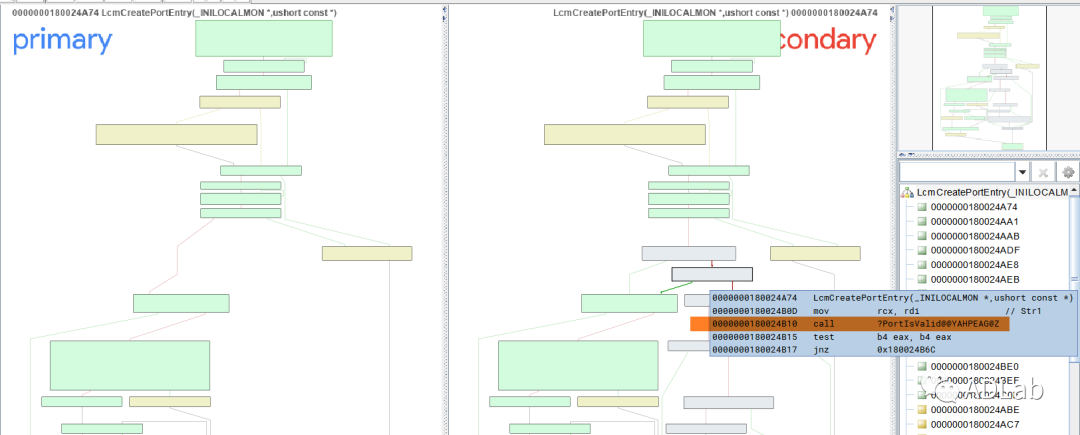 分析漏洞修复后的版本发现,微软在关键函数LcmCreatePortEntry(最终创建打印机端口的函数)中添加了相应的端口合法性检查代码。下图是关键函数LcmCreatePortEntry在修复前和修复后的Call Graph对比,可以看出:补丁的核心是通过函数PortIsValid对端口进行合法性检查。