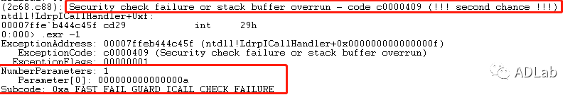 在上图中,程序终止于int 29h,而它的参数为0xa,对应FAST_FAIL_GUARD_ICALL_CHECK_FAILURE,由此推断问题可能出现在CFG的检查过程中。