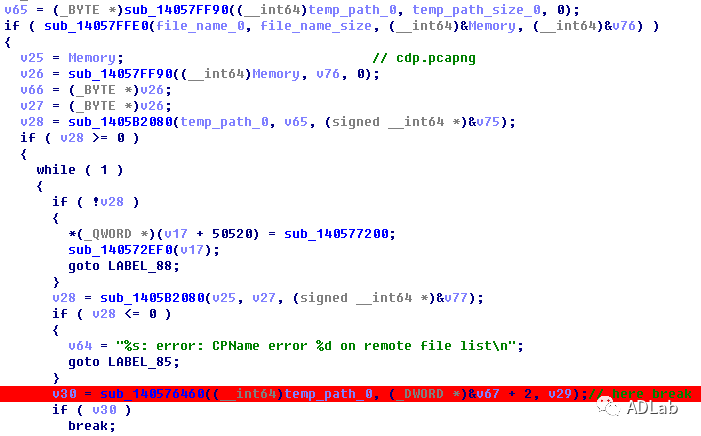 但是打开主机Temp目录下却没有发现该文件,于是初步断定这是程序崩溃原因。继续往下看,3个文件相关参数全都传入了sub_140579b30函数。