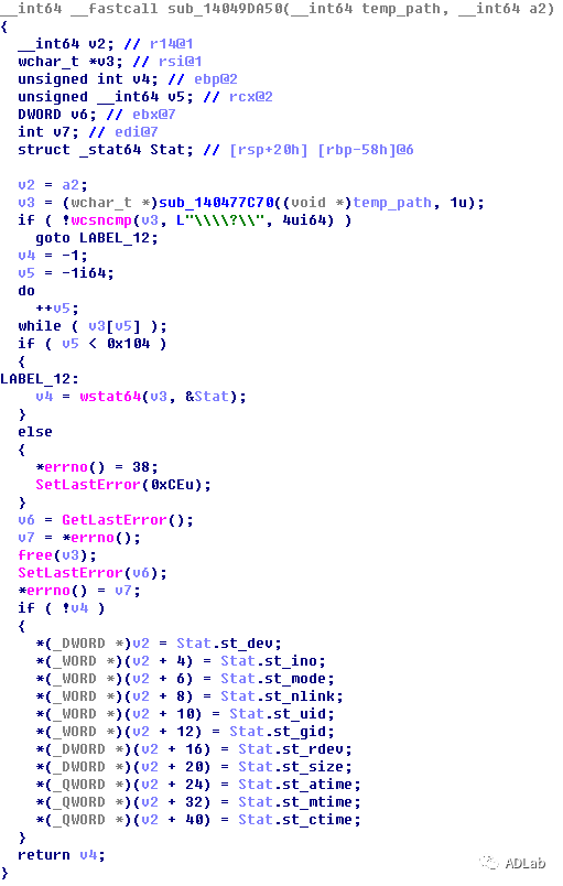 首先,函数sub_14049DA50通过sub_140477C70对字符串进行了处理。然后,调用wstat64获取相应路径的文件状态,如果成功获取则保存到一个结构体中,否则返回0xffffffff。由于Temp目录下并未发现备份文件,导致获取状态失败,从而返回0xffffffff。