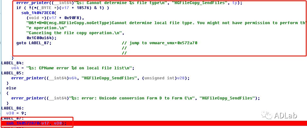 从函数调用栈中vmware_vmx+0x58b21地址向上追溯,动态调试程序,比较程序正常运行与异常崩溃的函数调用区别,定位到与程序崩溃相关的函数sub_1400965A0。