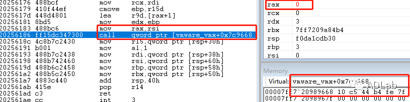 从sub_140572A70最终执行到sub_1400960C0,到达如下位置将vmware_vmx+0xb1ed90处的值赋给了rsi,即为0。