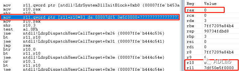 继续往下执行,将rsi中0值赋值到rax中,然后调用0x7ff8fab0c510处,即ntdll!LdrpDispatchUserCallTarget。