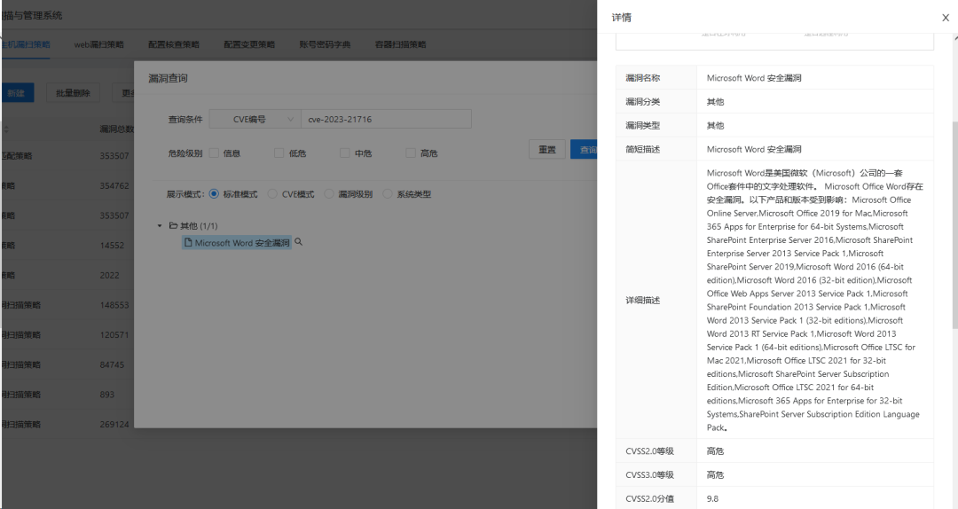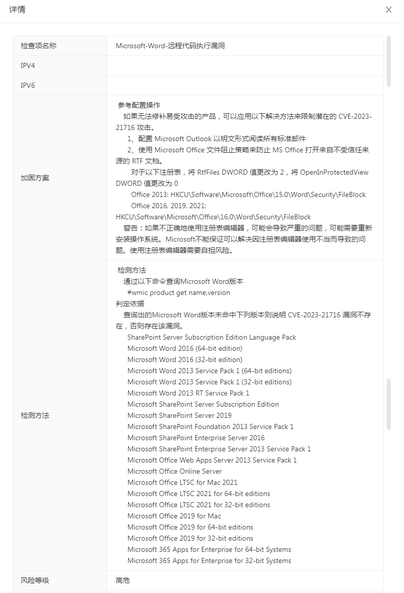 威廉希尔500欧洲指数资产与脆弱性管理平台实时采集并更新情报信息,对入库资产漏洞Microsoft Word远程代码执行漏洞(CVE-2023-21716)进行管理,如图所示: