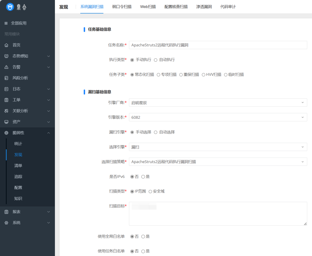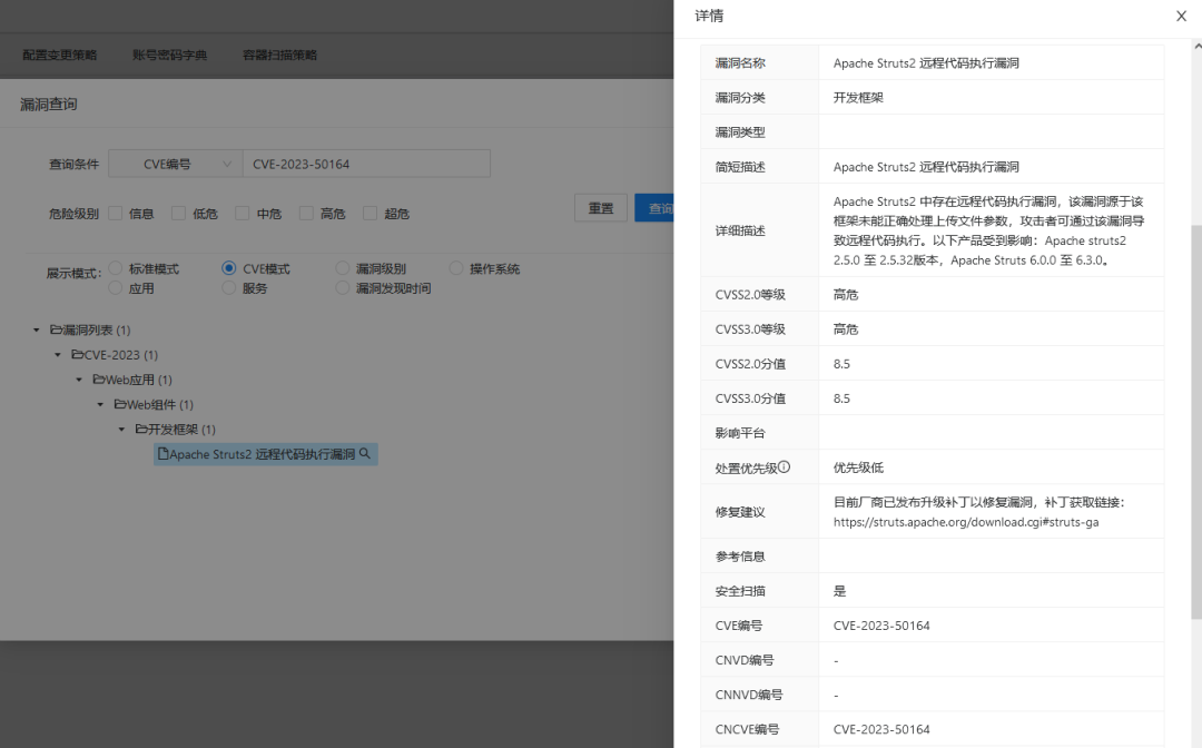1)在泰合的平台中,通过脆弱性发现功能针对“Apache Struts2 远程代码执行(CVE-2023-50164)”漏洞扫描任务,排查管理网络中受此漏洞影响的重要资产;