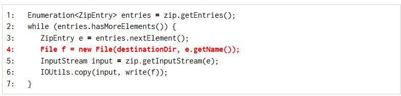 您需要利用此漏洞的第二件事是使用您自己的代码或库来提取归档文件。解压缩代码忽略存档中文件路径的验证时存在此漏洞。下面是一个易受攻击的代码片段的示例(以Java显示的示例)。