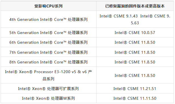 英特尔表示不再支持以下产品的英特尔®CSME固件。没有对以下系列CPU提供固件更新: