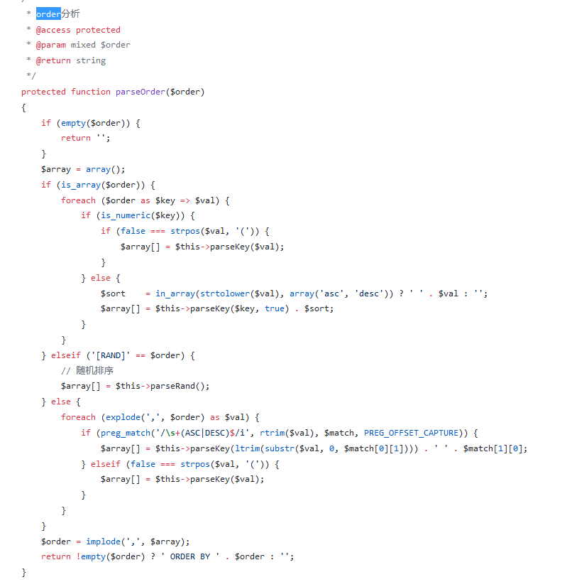 ThinkPHP 3.2.3的代码来看,处理数组当$field参数为关联数组(key-value)时,key值拼接到返回值中,SQL语句最终绕过了框架安全过滤得以执行。而补丁中增加了在order解析时对key值的安全过滤。