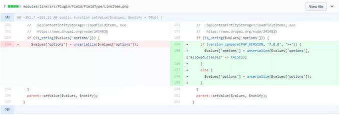 根据 commit log(https://github.com/drupal/core/commit/24b3fae89eab2b3951f17f80a02e19d9a24750f5)可以定位到漏洞的触发原因在于反序列化的操作: