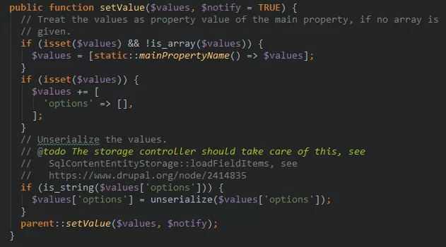 可以发现,在调用 setValue 方法的现场,$field_item为LinkItem。跟入setValue 方法,根据逻辑,如果$values为一个数组。且$values['options']存在,那么就执行反序列化操作。我们修改payload为即可触发反序列化。