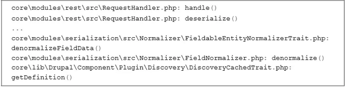 梳理了其整个调用链,从 REST 请求开始,先通过用户传入的 JSON 的 _links.type 获取了其对应的 Entity,再获取 Entity 内的 Fields 列表,遍历这个列表得到 key,从用户传入的 JSON 内取出 key,拼接成为 field_item:key 的形式(过程略),最终在 getDefinition 内查找了 definitions 数组内的字段定义,得到一个对应的 Field 的实例对象,过程大体如下: