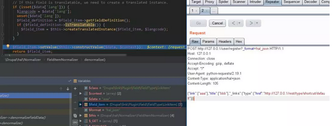 Shortcut 的 _links.type 为 http://127.0.0.1/rest/type/shortcut/default,可以在单步的时候找到,过程不叙。向 /user/register 发送 POST 请求,同时在 PHPStorm 内将断点下在