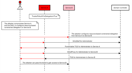 如果能够在B上配置基于资源的约束委派让服务A访问(拥有修改服务B的msDS-AllowedToActOnBehalfOfOtherIdentity属性权限),并通过服务A使用S4U2Self向域控制器请求任意用户访问自身的TGS 服务票据,最后再使用S4U2Proxy转发此票据去请求访问服务B的TGS服务票据,那么就将能模拟任意用户访问B的服务!