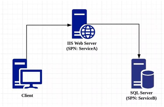 对于不同委派的工作模式,假设A为IIS Web Server,B为SQL Server,A需要使用数据库B以支撑用户访问。