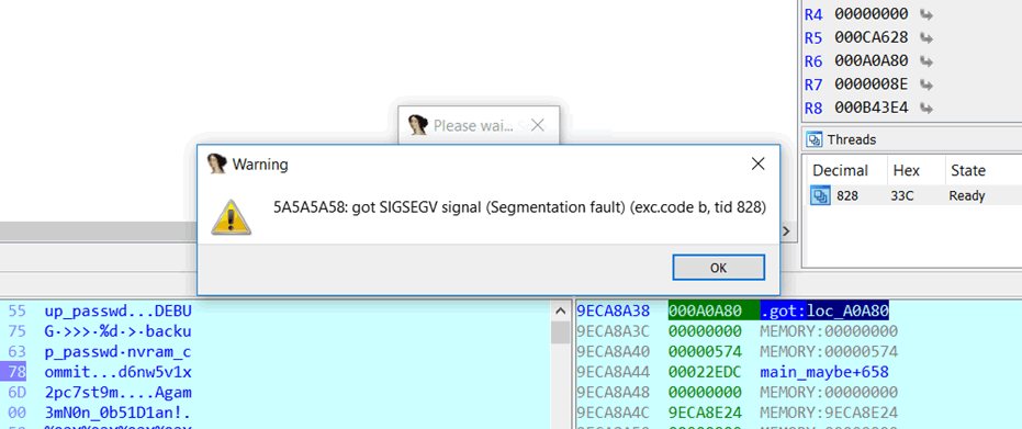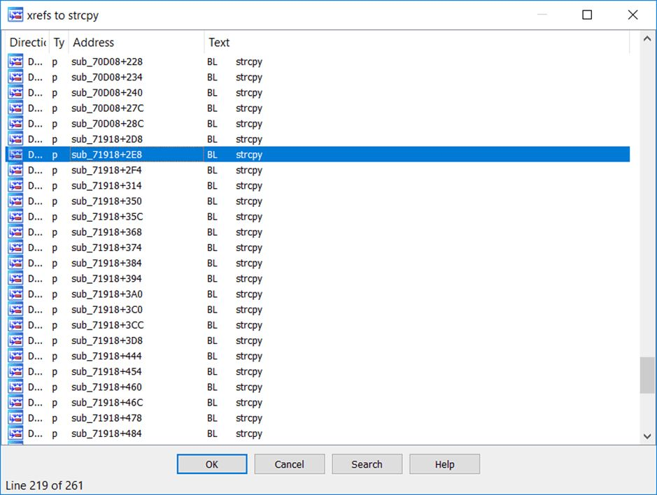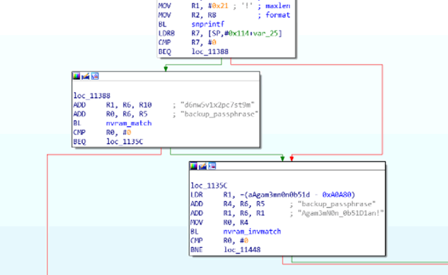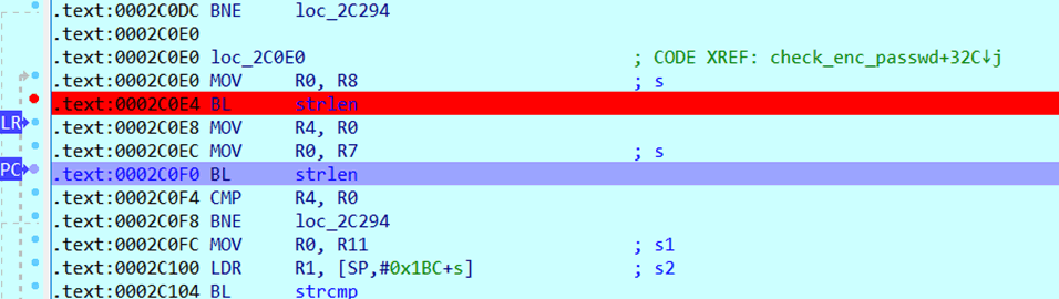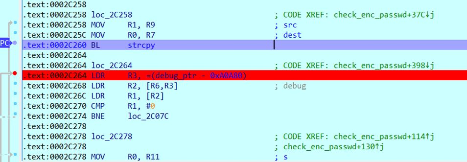 然后,合法编码的密码就会从NVRAM设备中取出,放入内存中。然后,pwd参数的值就会从.bss中取出来,这里使用了标准C调用strcpy将它放入动态分配的内存中。