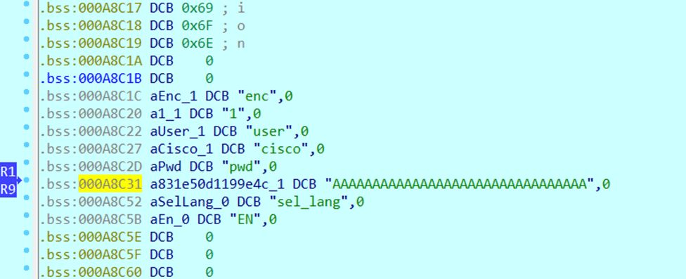 登陆是由httpd的0x0002C614处的函数处理的。请求参数会从POST请求中进行分析,然后token化之后放在可执行文件的静态数据库(.bss)。