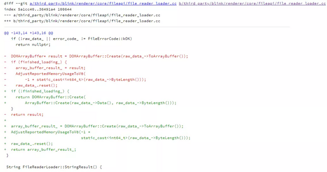 比较两个版本的源代码,发现third_party/blink/renderer/core/fileapi/file_reader_loader.cc有一些改动。在返回部分结果时复制ArrayBuffer以避免对同一个底层ArrayBuffer的多个引用。