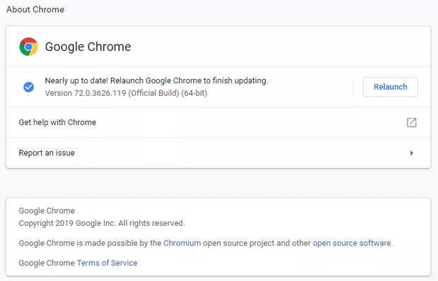 使用chrome浏览器的用户请打开chrome://settings/help页面查看当前浏览器版本,如果不是最新版(72.0.3626.121)会自动检查升级,重启之后即可更新到最新版。