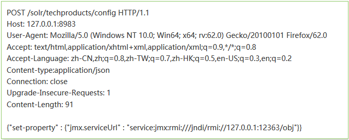 该漏洞本质是ConfigAPI允许通过HTTP POST请求配置Solr的JMX服务器。攻击者可以通过ConfigAPI将其配置指向恶意RMI服务器,利用Solr的不安全反序列化来触发Solr端上的远程代码执行。