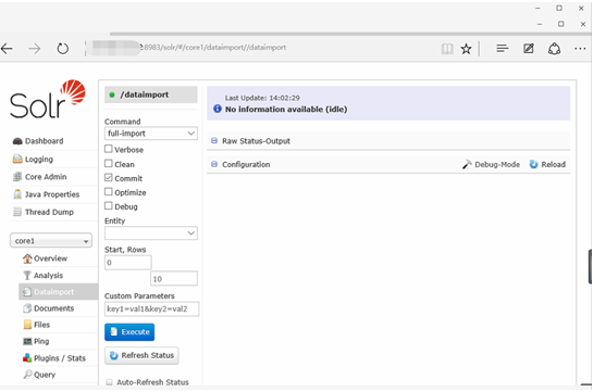 访问url:http://ip:8983/solr/#/core1/dataimport//dataimport,存在这个路径,就证明用户的solr,有可选模块DataImportHandler,存在漏洞利用风险。详见下图: