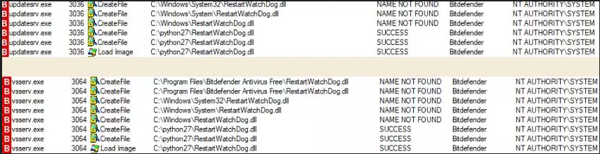 该漏洞源于缺乏对已签名且加载自可信位置的二进制的验证造成的。Bitdefender 的安全服务 (vsserv.exe) 和更新服务 (updatesrv.exe) 作为以系统权限签名的进程而启动。然而,他们尝试在 PATH 环境变量中的多个位置加载丢失的一个 DLL 文件 (‘RestartWatchDog.dll’),如图所示: