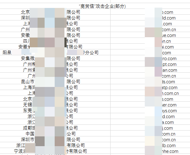 通过溯源分析,我们发现黑客疑似使用一款名为“****邮件群发器”的软件进行邮箱地址采集和邮件批量投递。据测算,该软件具有5000个/小时的邮箱地址采集能力,并且在发件时可以自动更换代理IP,已被黑客利用于针对对外贸企业的“自动化”攻击。部分受攻击企业如下: