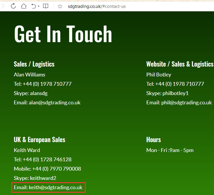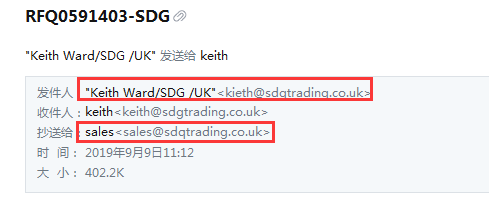 以其中一封邮件为例,从邮件头部信息中可以看到发件人为“Keith Ward/SDG /UK”,发件邮箱地址为kieth@sdgtrading.co.uk。sdgtrading是一家总部位于英国的进出口贸易公司,目前打开该公司官方网站可以正常访问。