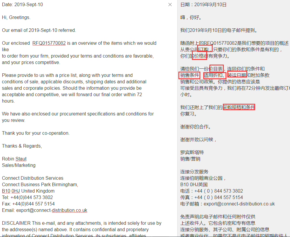 打开网站的contact-us页面我们发现有一个职务为UK & European Sales(英国及欧洲地区销售)的人员联系方式为keith@sdgtrading.co.uk,而这正是钓鱼邮件发件邮箱(有两个字母位置交换)。我们推测攻击者可能通过爬取或者人工搜集的方式获取了该贸易公司的邮件地址,然后伪装成该公司的销售人员发送钓鱼邮件进行攻击。