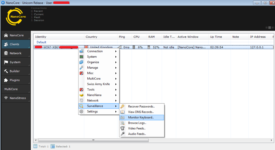 5、等待收件人打开附件并中招,通过远控木马NanoCore对目标进行远程控制。