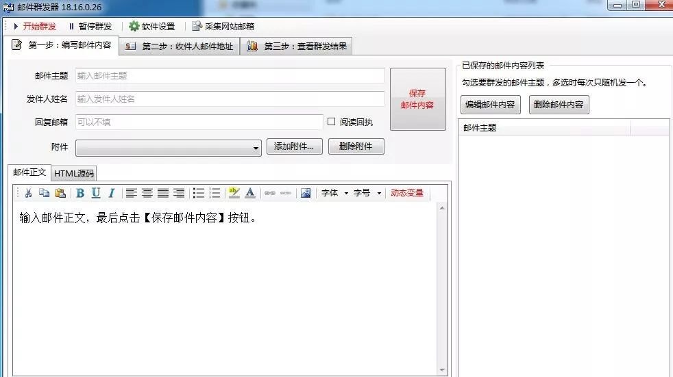 我们下载该软件,并进行注册和试用。根据其界面展示的功能,只需编写好邮件内容(任意填写发件人姓名)、批量添加收件人地址、点击“开始群发”三步,即可将邮件快速发送至大批的目标邮箱中。