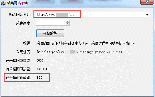 该软件还有一个重要的功能是,支持从指定网站采集目标邮箱。该功能页面默认的源网站地址为http[:]//www.****.biz/。我们尝试使用该网站进行邮箱采集,在10分钟之内可以采集到近800个邮箱地址,换算后一个小时之内可以采集到5000个邮箱,而这些被采集到的邮箱都存在被攻击的可能。