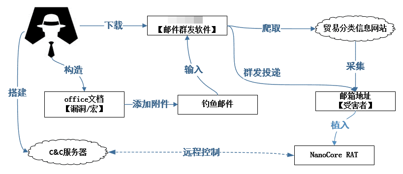 被下载植入的实际上是的经过混淆的远控木马NanoCore,NanoCore是使用.Net语言编写的功能强大的远程访问控制木马(RAT),可以在目标主机上进行文件操作,屏幕控制,运行指定程序,还支持插件扩展功能,被感染NanoCore木马的电脑会出现严重信息泄露,攻击者还可以利用中毒电脑为跳板,对目标网络继续进行渗透入侵。