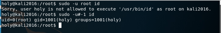 实际上会返回 0。这是因为 sudo命令本身就已经以用户 ID 为0 运行,因此当 sudo 试图将用户 ID 修改成 -1时,不会发生任何变化。这就导致 sudo 日志条目将该命令报告为以用户 ID 为 4294967295而非 root (或者用户ID为 0)运行命令。此外,由于通过–u 选项指定的用户 ID 并不存在于密码数据库中,因此不会运行任何 PAM 会话模块。