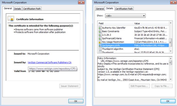 点击 UAC 窗口上的“显示详情”按钮后,攻击者就能够查看 Windows Certificate Dialog 中的 OID,而这些信息展示在详情标签“SpcSpAgencyInfo”上,而这也是问题存在的地方。