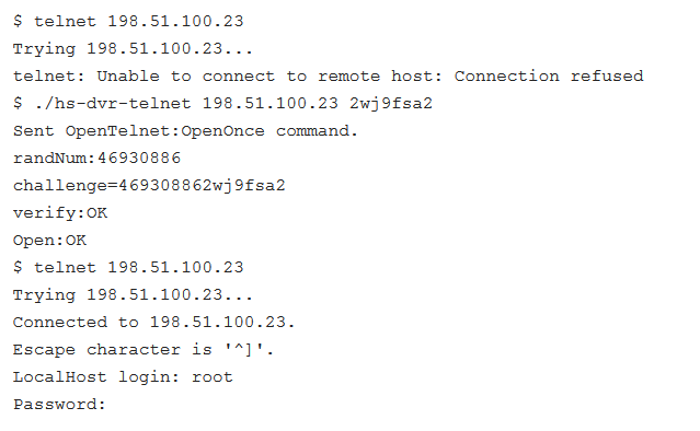 最新的固件版本虽然默认禁用了Telnet访问和调试端口(9527/tcp),但打开了9530/tcp端口,可以通过向包含海思芯片设备的9530端口发送一系列特殊命令来利用后门。这些命令可让攻击者在目标设备上启用Telnet服务,接着就可以使用以下六个默认Telnet凭据之一进行登录,获得一个root权限的shell。
