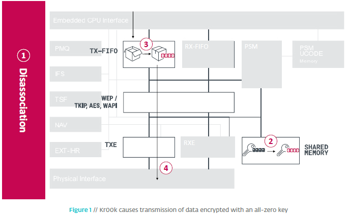 图1提供了芯片错误的示意图。研究人员指出,“Kr00k 漏洞在取消关联时出现。一旦发生取消关联的情况①,内存就会清除存储在无线网络接口控制器 (WNIC) WiFi 芯片中的会话密钥,即设置为0②。这种行为符合预期,因为取消关联后数据应该不再传输。然而,我们发现,即使在通过这个所有为0的密钥加密后③,遗留在该芯片传输缓冲区中的数据帧仍然会被传输④。”因为它用了所有的0,因此这种“加密”实际上会导致数据被解密且以明文形式遭暴露。