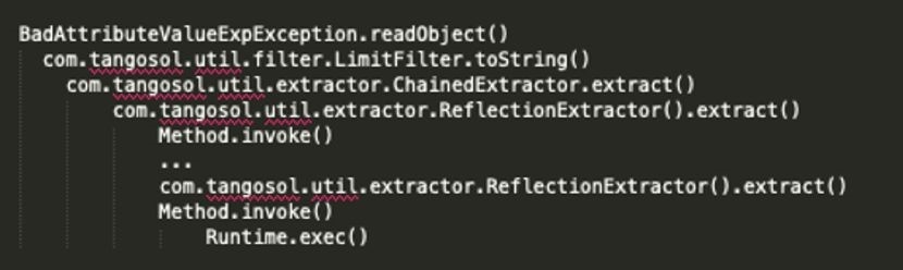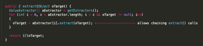 通常,利用远程代码执行漏洞需要多个方法调用。例如,在流行的Apache Commons Collections的gadget,攻击者需要使用ChainedTransformer将任意方法调用串接起来,从而实现RCE。与此类似,Coherence库中也提供了这样一个类(ChainedExtractor),可以让我们串接extract()调用: