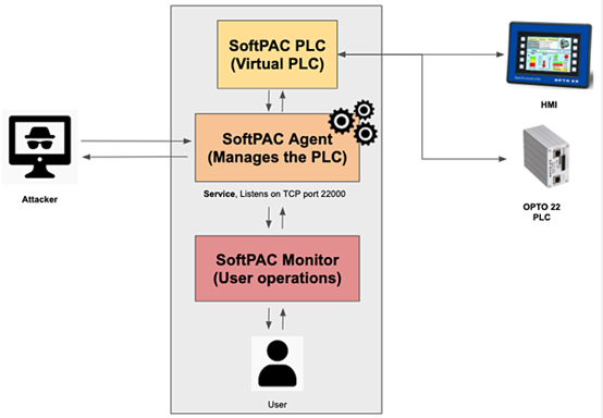 SoftPAC具有三个主要组件:Monitor,代理和虚拟控制器本身。Monitor允许用户启动和停止PAC服务以及更新SoftPAC固件。代理根据从Monitor收到的用户命令来管理SoftPAC PLC。但是在适当的情况下,攻击者可以通过外部远程连接对其进行操纵,详见下图: