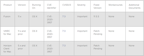 2020年5月28日VMware发布安全更新,修复了VMware ESXi,Workstation,Fusion,VMware Remote Console和Horizon Client中的多个安全漏洞(CVE-2020-3957,CVE-2020-3958,CVE-2020-3959),具体信息如下:
