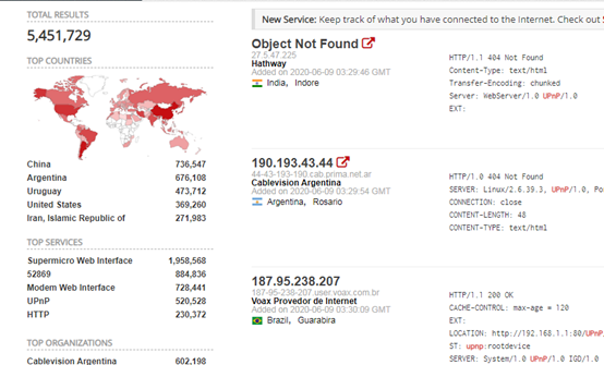 该漏洞影响范围大,使用shodan扫描发现大约有545万台开启UPnP功能的设备连接到互联网,这些设备容易成为物联网僵尸网络和APT组织的攻击目标。