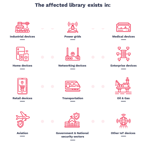 Ripple20影响了来自广泛领域的关键物联网设备,涉及了众多供应商。受影响的供应商范围很广,包括HP、Schneider Electric、Intel、Rockwell Automation、Caterpillar、Baxter以及许多其他在医疗、运输、工业控制方面的主要国际供应商、企业、能源(石油/天然气)、电信、零售和商业以及其他行业。