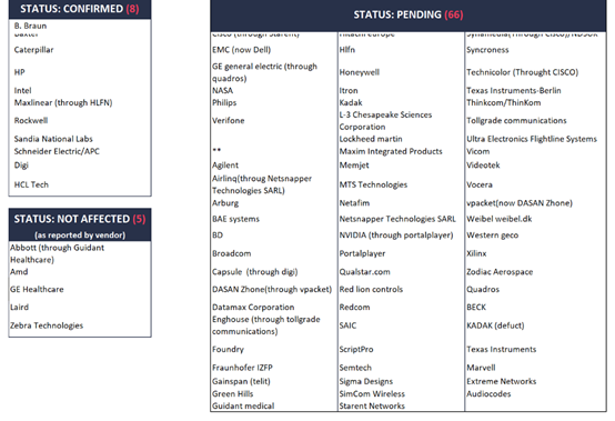 到目前为止,已经确认来自11个供应商的产品易受攻击,涉及打印机、UPS系统、网络设备、IP摄像机、视频会议系统、楼宇自动化设备和ICS设备等。但不止于此,研究人员认为这些漏洞可能会影响来自100多家供应商的数亿台设备。