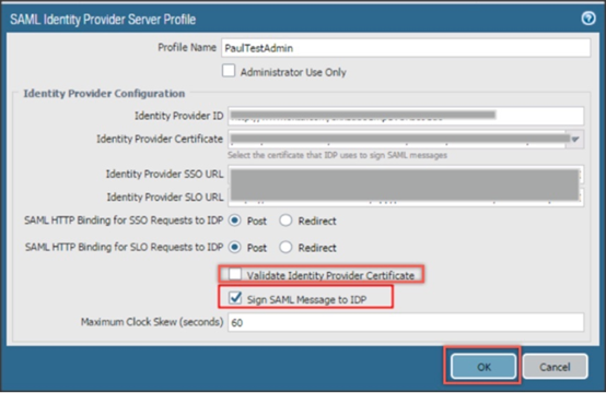 (b)如果身份提供商(IDP)证书是证书颁发机构(CA)签名的证书,则确保在SAML身份提供商服务器配置文件中启用了“身份提供商证书”选项。默认情况下,许多流行的IDP都会生成自签名IDP证书,并且无法启用“验证身份提供商证书”选项。要使用由CA签名的证书,可能需要执行其他步骤。该证书可以由内部企业CA,PAN OS上的CA或公共CA签名。可在https://knowledgebase.paloaltonetworks.com/KCSArticleDetail?id=kA14u0000008UXP上获取有关在IDP上配置CA颁发的证书的说明。