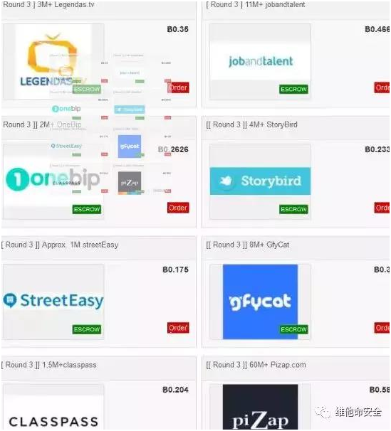 Gnosticplayers在暗网市场上发布了第三批待售的用户账户数据,涉及到8个网站的9276万用户。这8个网站包括:Legendas.tv(386万)、Jobandtalent(1100万)、Onebip(260万)、StoryBird(400万)、StreetEasy(100万)、GfyCat(800万)、ClassPass(150万)和Pizap(6080万)。这批用户数据的总价格为2.6249个比特币,共约9400美元。