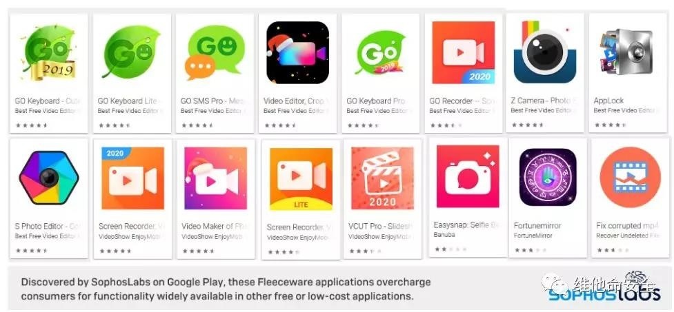 Sophos安全研究人员发现了一组新的fleeceware APP,这些APP已经被超过6亿Android用户下载安装。fleeceware是指谷歌Play商店中存在的一种新型金融欺诈行为,这些APP滥用Android应用的试用期功能向用户收费。默认情况下Android用户在注册使用具有试用期的APP时必须手动取消试用,然而大多数用户只是在不喜欢的时候卸载APP,绝大多数开发者将这种卸载行为视为取消试用,但一些开发者在用户卸载后没有取消试用并且继续收费。Sophos最初发现的24个APP包括二维码扫描器、计算器等,它们以这种方式向用户收取每年100美元到240美元的订阅费用。在近日发布的一份报告中,Sophos发现了另外25个此类APP,其总安装量超过6亿,完整的APP列表请参考以下链接。