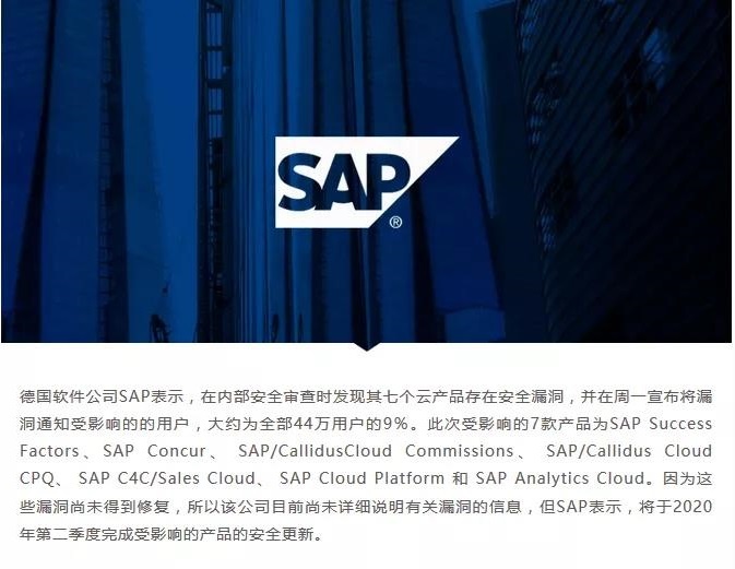 2、软件公司SAP宣布其产品存在漏洞,或将影响9%用户